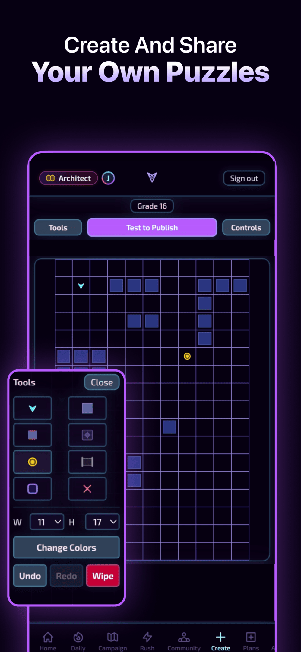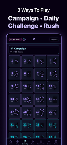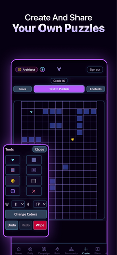 Game modes: Campaign (90+ hand-crafted levels), Puzzle Rush (3-minute timed challenge), Daily Challenge (leaderboards), Community (play and rate levels), Editor (design your own).